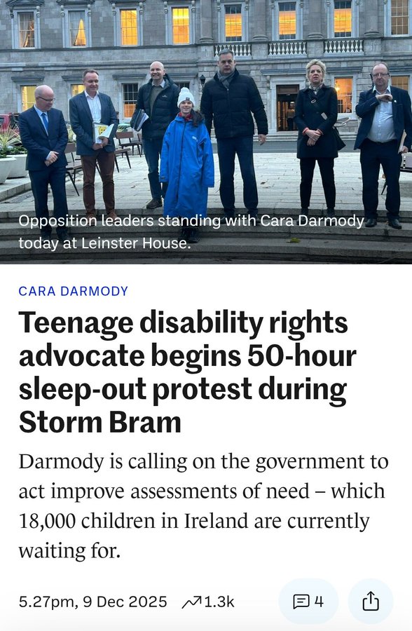 That a Child is forced to do this, again. Teenage Disability Rights advocate begins 50-hour Sleep-out Protest during Storm Bram Darmody is calling on the government to act improve assessments of need – which 18,000 Children in Ireland are currently waiting for.