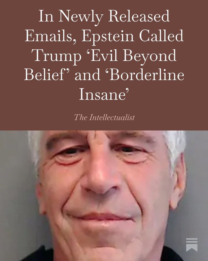 13 Dec, 2025 Uncategorized In a series of newly released emails, Jeffrey Epstein described President Trump as “evil beyond belief,” “borderline insane” and “f***ing crazy,” offering a rare, candid view of how the disgraced financier saw the president in private. Posted by Fred Bassett eintellectualistofficial.substack.com/p/in-newly-rel Share this: Click to share on X (Opens in new window) X Click to share on Facebook (Opens in new window) Facebook Click to share on LinkedIn (Opens in new window) LinkedIn Click to share on Reddit (Opens in new window) Reddit Click to email a link to a friend (Opens in new window) Email More Click to print (Opens in new window) Print Like Loading... Related