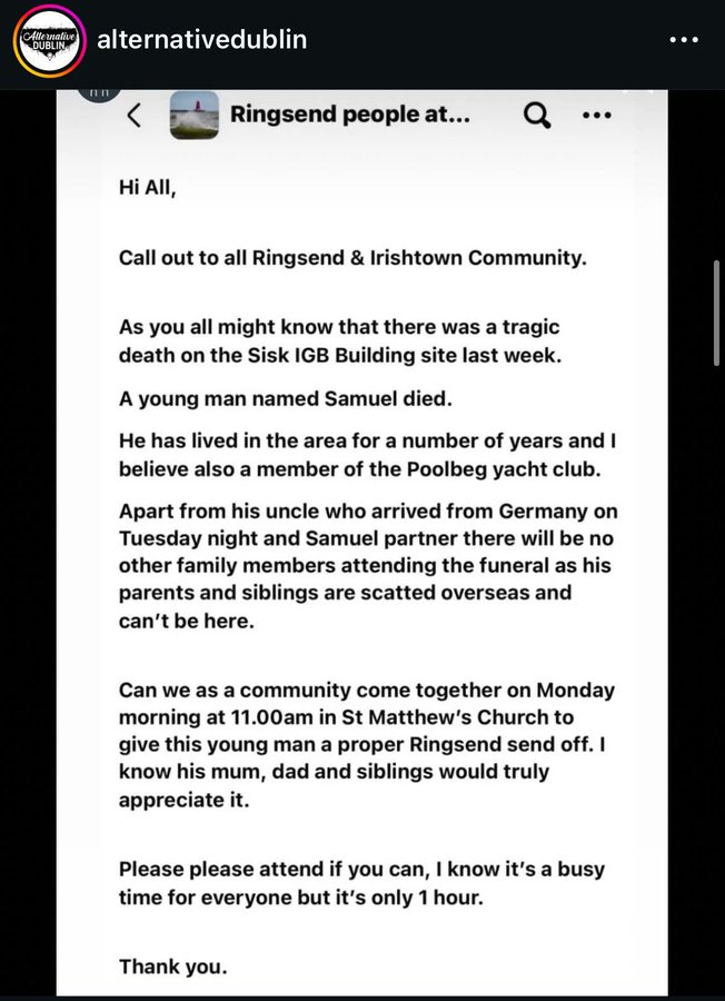 Saw this online and had to share. Last week, a young man called Samuel Benjamin Small tragically lost his life following a fall at the Sisk IGB construction site in Ringsend. Originally from South Africa and a member of the Poolbeg Yacht Club, Samuel had built a life in Dublin, yet most of his immediate family remains overseas and cannot attend his funeral. In a moving show of solidarity, the Ringsend and Irishtown community is calling on locals or anyone whose free to gather at St. Matthew’s Church tomorrow, Monday 22nd December at 11:00am to ensure he receives a proper send-off. RIP