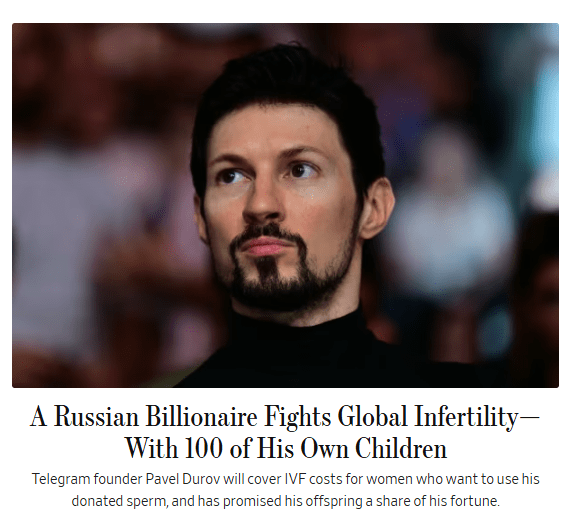 The Telegram founder has 100+ biological children across 12 countries. He’s covering IVF costs for women who want to use his sperm. And he’s promising all of them a share of his $17 billion fortune. While governments hold conferences about declining birth rates, Pavel said “I’ll handle this myself” and meant it. Sperm counts are plummeting worldwide. Male fertility is in freefall. While everyone else debates policy solutions to crashing birth rates, Durov built a one-man repopulation program. Elon responded with “rookie numbers”. These two are competing to singlehandedly reverse demographic collapse. Source: WSJ