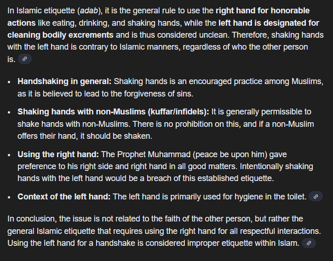 30 Dec, 2025 Uncategorized Basil, you may notice that some more radical muslims will go out of their way to shake the kuffar (infidel) hand with their left dirty hand while always shaking hands with muslims using their right hand. Posted by Fred Bassett Badger Bites UK @BadgerBitesUK · Share this: Click to share on X (Opens in new window) X Click to share on Facebook (Opens in new window) Facebook Click to share on LinkedIn (Opens in new window) LinkedIn Click to share on Reddit (Opens in new window) Reddit Click to email a link to a friend (Opens in new window) Email More Click to print (Opens in new window) Print Like Loading... Related