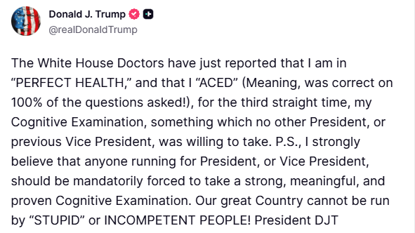 Trump: The White House Doctors have just reported that I am in “PERFECT HEALTH,” and that I “ACED” (Meaning, was correct on 100% of the questions asked!), for the third straight time, my Cognitive Examination, something which no other President, or previous Vice President, was willing to take. P.S., I strongly believe that anyone running for President, or Vice President, should be mandatorily forced to take a strong, meaningful, and proven Cognitive Examination. Our great Country cannot be run by “STUPID” or INCOMPETENT PEOPLE!