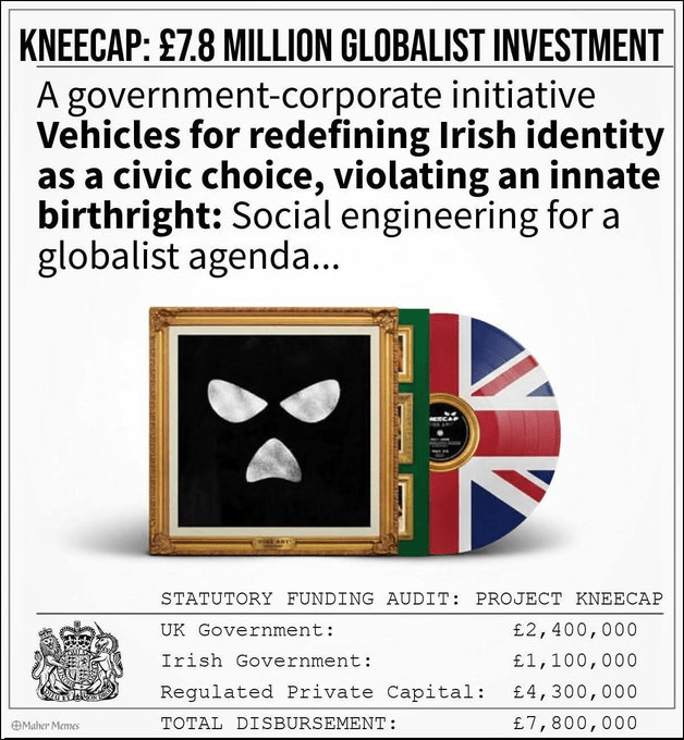 Kneecap’s State Funding THE FINANCIAL FOOTPRINT (EST. £7.8M+ TOTAL) Below is the breakdown of government and state-regulated investment in the Kneecap “brand”: UK GOVERNMENT (DCMS/BFI): Initial Film Production Grant: £575,000 Production “Top-up” Grant: £200,000 Global Marketing & Advertising: £60,000 Staffing/Crew Diversity Grant: £35,000 US Sundance Festival Debut: Approx. £10,000 Automatic UK State Rebate (AVEC): Est. £600,000 UK GOVERNMENT (Dept. for Business): “King’s Stash” Lawsuit Settlement: £14,250 Taxpayer-paid legal costs: Est. £50,000 NI GOVERNMENT (Dept. for Economy/Communities): Core Film Production Support (NI Screen): £805,000 Music/Momentum Touring Grants (Arts Council): Est. £15,000 REPUBLIC OF IRELAND GOVERNMENT: ROI Production Funding (Screen Ireland): Est. £333,000 Automatic ROI State Rebate (Section 481): Est. £500,000 Irish Language Broadcast Fund (TG4): Est. £125,000 Travel Grant (Culture Ireland): Approx. £5,000 STATE-REGULATED MARKETPLACE: Sony Pictures Classics (Global Rights): Est. £1,500,000 Commercial Market Ad Spend/Promotion: Est. £1,000,000 Domestic Distribution & PR: Est. £1,000,000 Unallocated Auxiliary Grants & Global Distribution: £972,750