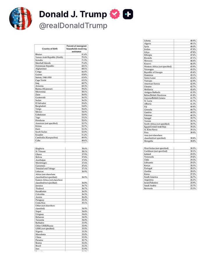 5 Jan, 2026 Uncategorized President Trump has just released the data on what percentage of immigrants by country are receiving benefits Keir Starmer still refuses to do this in the UK Posted by Fred Bassett Share this: Click to share on X (Opens in new window) X Click to share on Facebook (Opens in new window) Facebook Click to share on LinkedIn (Opens in new window) LinkedIn Click to share on Reddit (Opens in new window) Reddit Click to email a link to a friend (Opens in new window) Email More Click to print (Opens in new window) Print Like Loading... Related