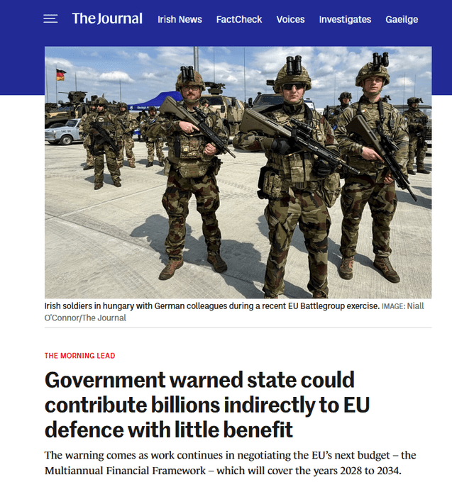 Coming up after midnight Reports that the Government has been warned that Ireland could end up contributing over €7 billion indirectly to massive defence spends in Europe through its EU contributions but will benefit little in return. Dont Bend to the Bullshit EU.
