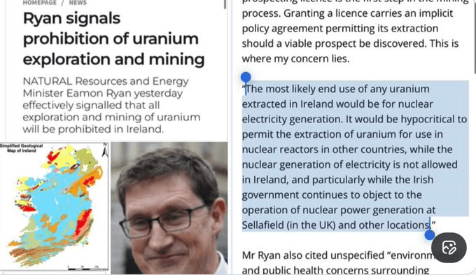 If current Irish Govt had any agency to actually do anything… they could lift all prohibitions on uranium exploration. In 2007 Eamon Ryan, while Minister for “Energy & Natural Resources” banned exploration for Uranium deposits across Ireland. His reason: Sleeping Idiot Ryan, gone on Fat Pensions.