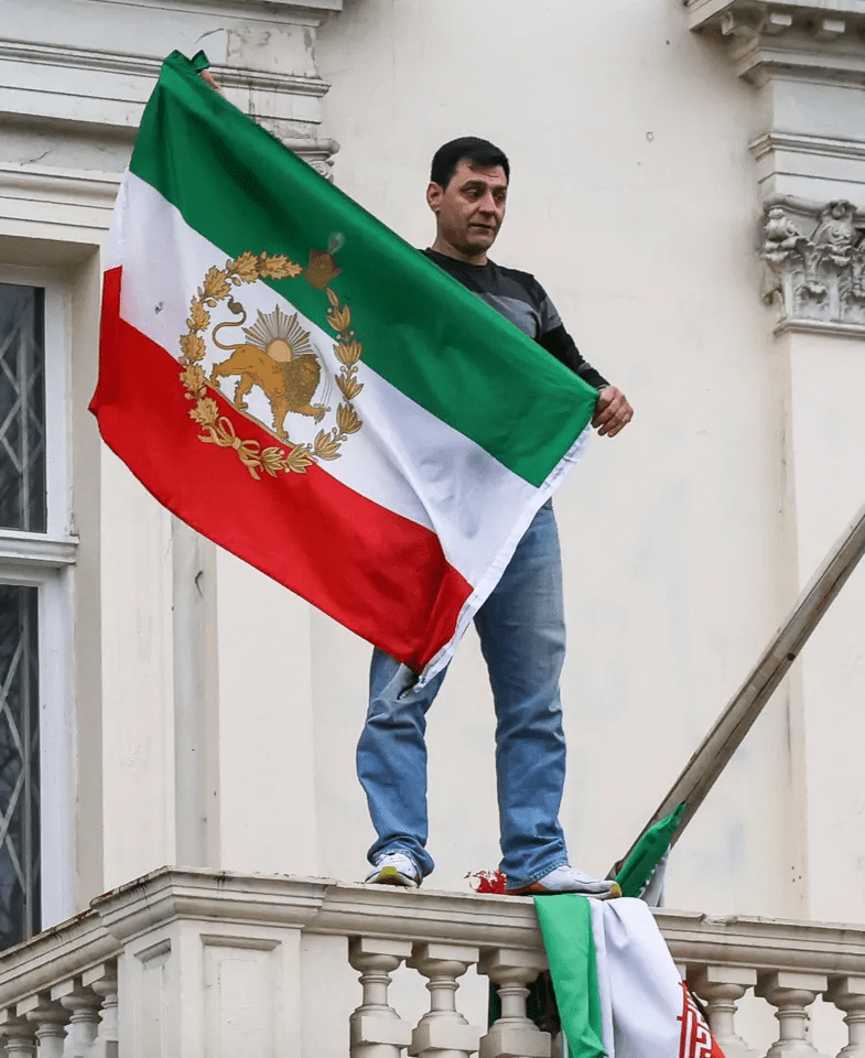 The man tore down the Islamic Republic of Iran flag from the building and replaced it with the monarchist Lion and Sun flag.