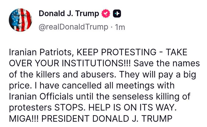 14 Jan, 2026 Uncategorized President Trump sends a message to the brave revolutionaries in Iran. Including: “Help is on it’s way Posted by Fred Bassett Tommy Robinson @TRobinsonNewEra Share this: Click to share on X (Opens in new window) X Click to share on Facebook (Opens in new window) Facebook Click to share on LinkedIn (Opens in new window) LinkedIn Click to share on Reddit (Opens in new window) Reddit Click to email a link to a friend (Opens in new window) Email More Click to print (Opens in new window) Print Like Loading... Related