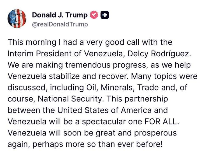 “This morning I had a very good call with the Interim President of Venezuela, Delcy Rodríguez. We are making tremendous progress, as we help Venezuela stabilize and recover. Many topics were discussed, including Oil, Minerals, Trade and, of course, National Security. This partnership between the United States of America and Venezuela will be a spectacular one FOR ALL. Venezuela will soon be great and prosperous again, perhaps more so than ever before!”