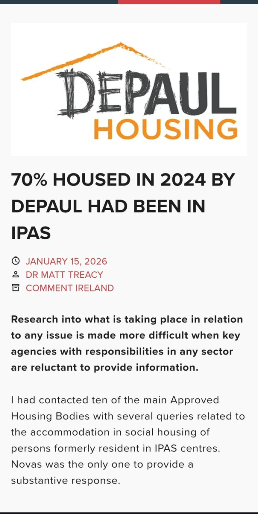 70% of social housing allocated by Approved Housing Body (AHB) – De Paul in 2024 went to asylum seekers granted leave to remain in Ireland. Fine Gael & Fianna Fáil are funneling billions to these AHBs who then hand a large amount of these homes to foreign nationals.