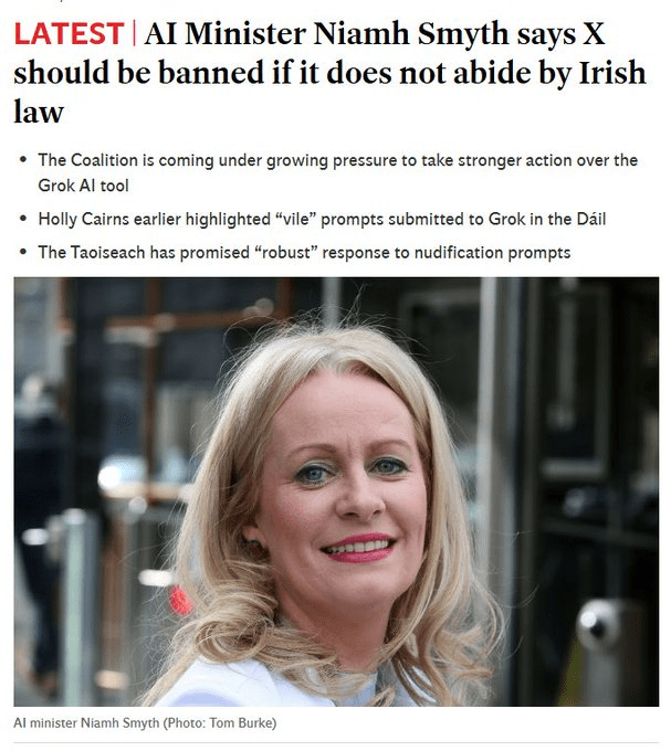 17 Jan, 2026 Uncategorized The amount of Irish calling for X to be banned/suspended is proof of how they hate the truth being exposed Before X the Irish were kept in the dark Any TD looking for X to be banned should have their affairs investigated Posted by Fred Bassett Gardawhistleblower Share this: Share on X (Opens in new window) X Share on Facebook (Opens in new window) Facebook Share on LinkedIn (Opens in new window) LinkedIn Share on Reddit (Opens in new window) Reddit Email a link to a friend (Opens in new window) Email More Print (Opens in new window) Print Like Loading... Related