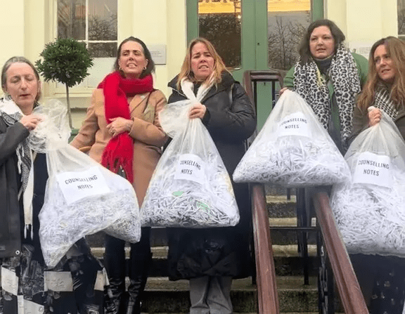 Speaking on the steps of the department, Paula Doyle, who had her counselling notes used in evidence during a rape trial, said the experience left her feeling so “contaminated and vile” she self-harmed.