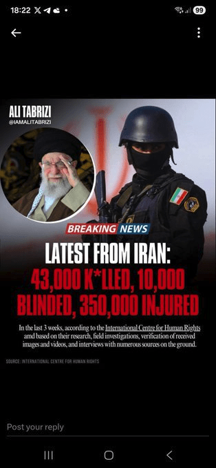 Reports from Iran: According to the International Centre for Human Rights, over the past three weeks an estimated 43,000 people were reportedly killed, 10,000 blinded, and 350,000 injured, based on field investigations and verified footage.