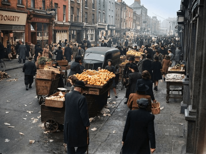 Moore Street bustles with traders & barrows again. Then only decades earlier, the buildings sheltered leaders of the Rising in their last stand. Now it’s oranges & onions, but the memory of 1916 clings to the bricks & cobbles.