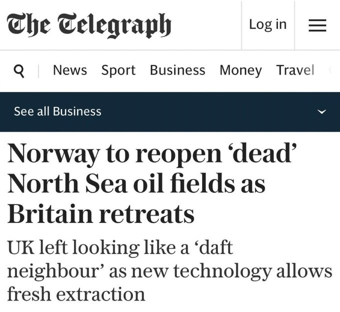 27 Jan, 2026 Uncategorized Norway are going to make an absolute fortune from the North Sea while we ignore it in favour of Chinese windmills Posted by Fred Bassett The UK is led by absolute morons. Basil the Great @BasilTheGreat Share this: Share on X (Opens in new window) X Share on Facebook (Opens in new window) Facebook Share on LinkedIn (Opens in new window) LinkedIn Share on Reddit (Opens in new window) Reddit Email a link to a friend (Opens in new window) Email More Print (Opens in new window) Print Like Loading... Related
