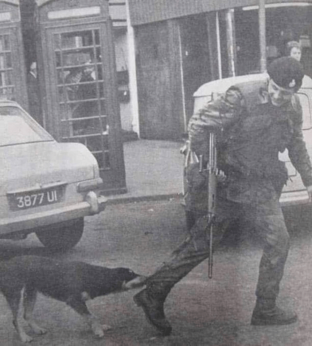 This was Saoirse the rebel dog. She was in the RA, when patrols came through the district she used to let on to sleep until the last British soldier passed then went clean for the ankles.She would have played dead if got kicked. She got a full military funeral. RIP Saoirse.