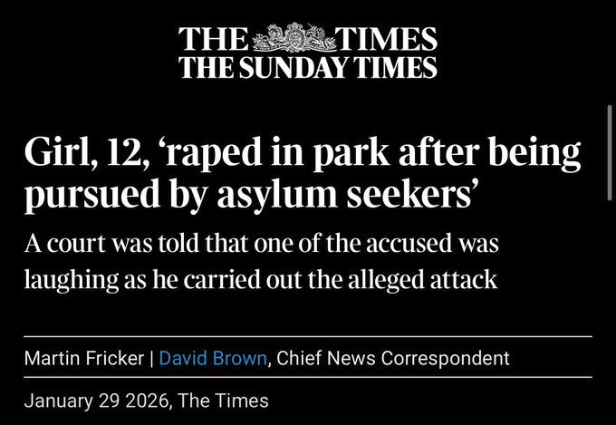 30 Jan, 2026 Uncategorized An Afghan national abducted the a 12 year old girl from a street before repeatedly raping her and taking photographs of the attack. Just another day in the UK. Open borders do not work. When will the UK wake up? Posted by Fred Bassett Katie Miller @KatieMiller Share this: Share on X (Opens in new window) X Share on Facebook (Opens in new window) Facebook Share on LinkedIn (Opens in new window) LinkedIn Share on Reddit (Opens in new window) Reddit Email a link to a friend (Opens in new window) Email More Print (Opens in new window) Print Like Loading... Related