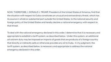 30 Jan, 2026 Uncategorized BREAKING: President Trump signs executive order declaring a NATIONAL EMERGENCY regarding Communist CUBA and prepares tariffs on countries supplying them oil Posted by Fred Bassett Share this: Share on X (Opens in new window) X Share on Facebook (Opens in new window) Facebook Share on LinkedIn (Opens in new window) LinkedIn Share on Reddit (Opens in new window) Reddit Email a link to a friend (Opens in new window) Email More Print (Opens in new window) Print Like Loading... Related