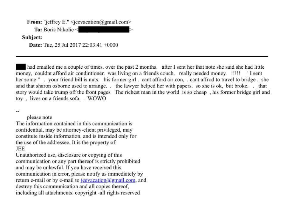 “The richest man in the world is so cheap , his former bridge girl andtoy (sic), lives on a friends sofa. . WOWO,” Jeffrey Epstein wrote in 2017 email to Gates’ advisor Boris Nikolic.