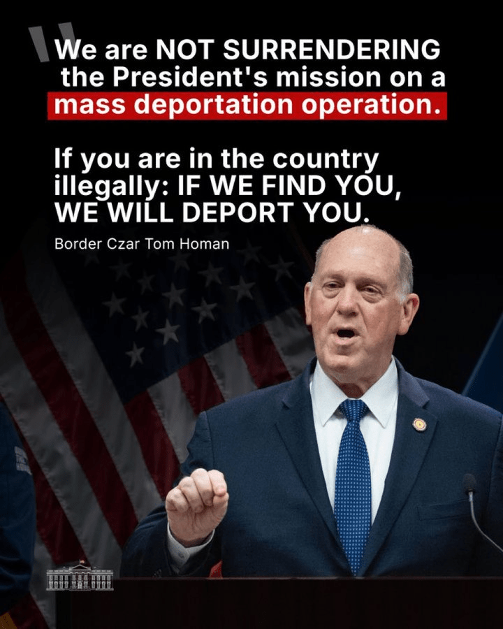 5 Feb, 2026 Uncategorized BORDER CZAR TOM HOMAN: “If you are in the country illegally: IF WE FIND YOU, WE WILL DEPORT YOU. Posted by Fred Bassett Proud Elephant @ProudElephant Share this: Share on X (Opens in new window) X Share on Facebook (Opens in new window) Facebook Share on LinkedIn (Opens in new window) LinkedIn Share on Reddit (Opens in new window) Reddit Email a link to a friend (Opens in new window) Email More Print (Opens in new window) Print Like Loading... Related