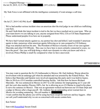 A July 2019 email in the files contains disturbing allegations. The sender claims Richard Marcinko, an Epstein associate, “was sentenced in Mexico in 2017 to a life sentence for impregnating an 11 year old girl.” The bombshell: “her son’s dna matches Waynes 100%” referring to former US Ambassador Earl Anthony Wayne. They allege an ex-US Marine is serving the sentence in Marcinko’s place after “an agreement worked out between our US State Dept and a judge in Mexico after a huge payoff.” The sender claims Wayne “has an outstanding arrest warrant here in Mexico for avoiding sentencing.” Unverified. But the FBI had this weeks after Epstein’s arrest.