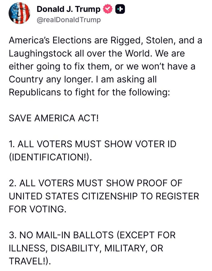 I am asking all Republicans to fight for the following: ALL VOTERS MUST SHOW VOTER ID. ALL VOTERS MUST SHOW PROOF OF UNITED STATES CITIZENSHIP TO REGISTER FOR VOTING. NO MAIL-IN BALLOTS (EXCEPT FOR ILLNESS, DISABILITY, MILITARY, OR TRAVEL!).” Sounds like common-sense guardrails, not some radical idea. Source: Truth Social
