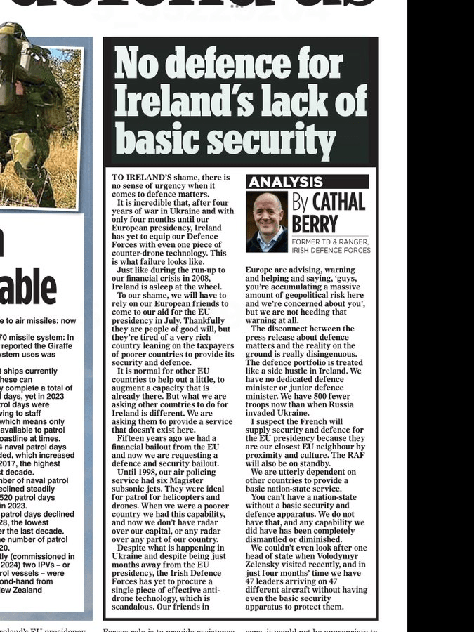 Great article by Cathal Berry on disgraceful failure of successive govs since the departure of the Troika to ensure our defence forces are fully technically equipped & modernised. While we are reliant on the goodwill of others to defend our state neutrality is the idiotic focus