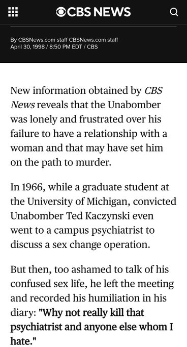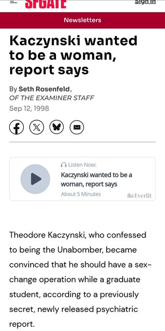 9 Feb, 2026 Uncategorized WE NEED TO TALK ABOUT TRANSGENDER VIOLENCE. Posted by Fred Bassett They can try to memory hole all they want. They can pretend it’s “rare.”It’s not, and it never has been. Let’s start with Ted Kaczynski StarlessSky @gigglinghowl Share this: Share on X (Opens in new window) X Share on Facebook (Opens in new window) Facebook Share on LinkedIn (Opens in new window) LinkedIn Share on Reddit (Opens in new window) Reddit Email a link to a friend (Opens in new window) Email More Print (Opens in new window) Print Like Loading... Related