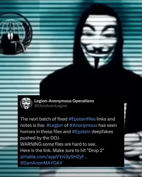 27 Feb, 2026 Uncategorized Anonymous: claim they’ve cracked sealed Epstein files, releasing them in batches over the coming days. Posted by Fred Bassett They warn: “some files are extremely difficult to look at.” Share this: Share on X (Opens in new window) X Share on Facebook (Opens in new window) Facebook Share on LinkedIn (Opens in new window) LinkedIn Share on Reddit (Opens in new window) Reddit Email a link to a friend (Opens in new window) Email More Print (Opens in new window) Print Like Loading... Related