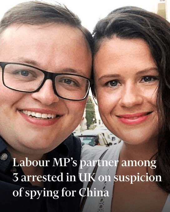 4 Mar, 2026 Uncategorized The partner of a sitting Labour MP is one of the three people arrested by UK counterterror police over claims they assisted China’s intelligence service. https://ft.trib.al/NHtky0s Posted by Fred Bassett Share this: Share on X (Opens in new window) X Share on Facebook (Opens in new window) Facebook Share on LinkedIn (Opens in new window) LinkedIn Share on Reddit (Opens in new window) Reddit Email a link to a friend (Opens in new window) Email More Print (Opens in new window) Print Like Loading... Related