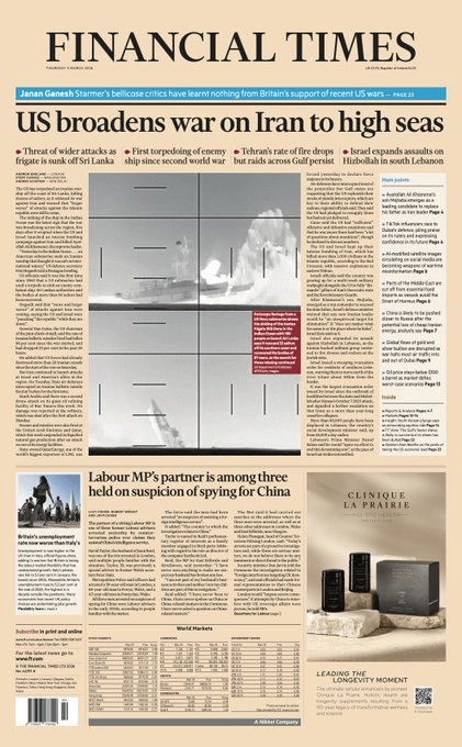 5 Mar, 2026 Uncategorized Just published: front page of the Financial Times, UK edition, Thursday March 5 Posted by Fred Bassett Share this: Share on X (Opens in new window) X Share on Facebook (Opens in new window) Facebook Share on LinkedIn (Opens in new window) LinkedIn Share on Reddit (Opens in new window) Reddit Email a link to a friend (Opens in new window) Email More Print (Opens in new window) Print Like Loading... Related