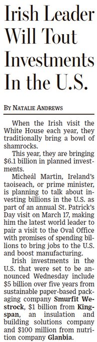 The Taoiseach will bring more than a bowl of shamrock to the White House this year. That these Irish companies would be making these investments regardless of who was US president doesn’t matter. What matters with this president is the appearance of monetary wins. Very good move from the Irish government side, as was giving the story to the Wall Street Journal.